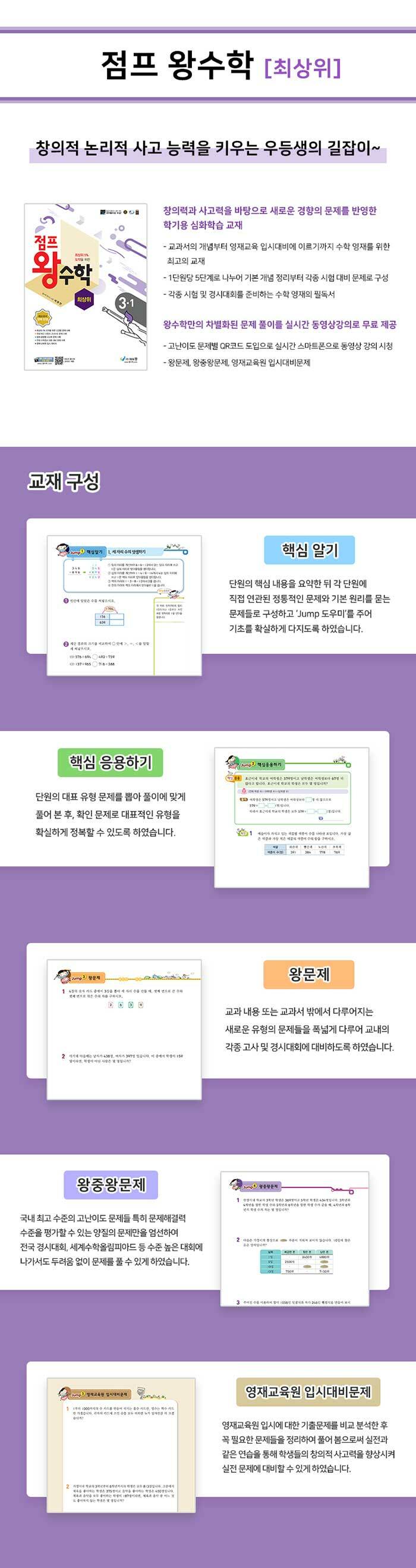 사고력과 창의력을 기를 수 있는 새로운 경향의 문제들로 구성된 교재① 단원의 핵심 내용을 요약한 뒤 각 단원에 직접 연관된 정통적인 문제와 기본 원리를 묻는 문제들로 구성하고 Jump 도우미‘를 주어 기초를 확실하게 다질 수 있습니다.