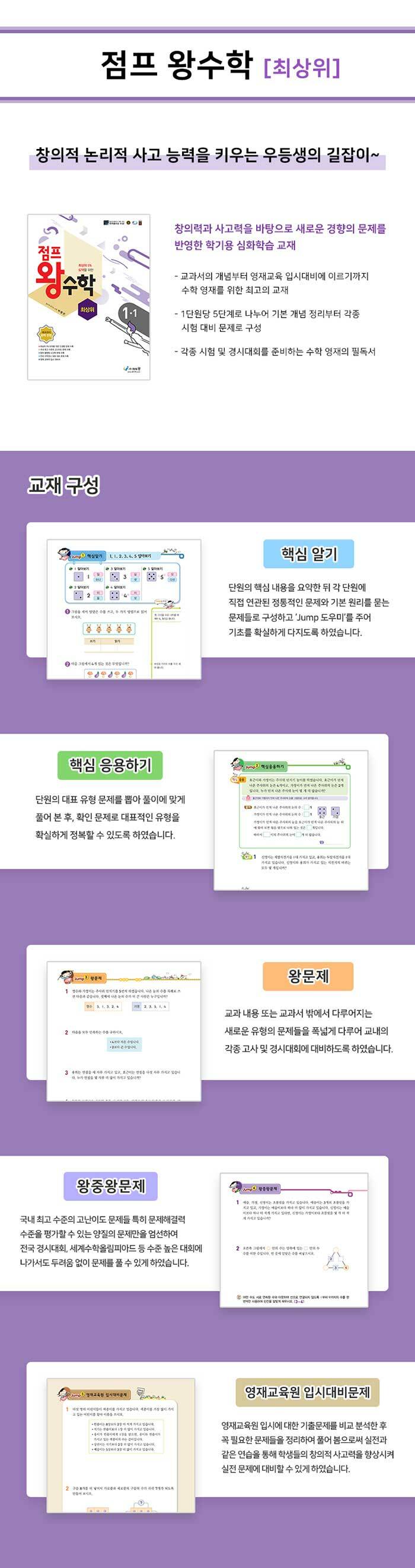 사고력과 창의력을 기를 수 있는 새로운 경향의 문제들로 구성된 교재다. 국내 최고 수준의 고난이도 문제들, 특히 문제해결력 수준을 평가할 수 있는 양질의 문제만을 엄선하여 전국 경시대회, 세계수학올림피아드 등 수준 높은 대회에 나가서도 두려움 없이 문제를 풀 수 있다.