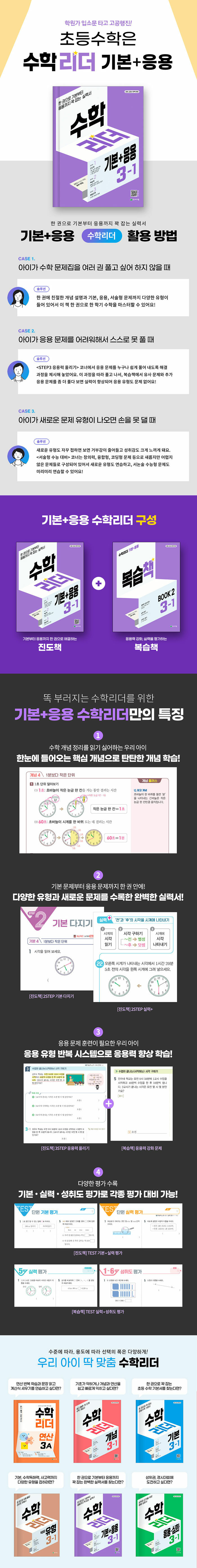 수학리더 기본+응용은 시각적인 개념 설명을 통해 쉽게 개념을 익힐 수 있고, 한 권으로 기본문제부터 응용문제까지 다양한 수준의 문제를 풀면서 수학 실력을 탄탄하게 다지고 응용력과 문제해결력을 기를 수 있도록 구성되어 있다. 또한 QR코드를 통해 개념 학습 영상을 제공하고, 서술형 수능 대비 코너에서 미래형 서·논술 수능형 문제를 미리 연습할 수 있다. [복습책]에서는 [진도책] STEP3의 응용문제를 한번 더 반복 학습할 수 있고, 실력평가, 성취도평가를 통해 실력 점검 및 시험 대비를 할 수 있다.