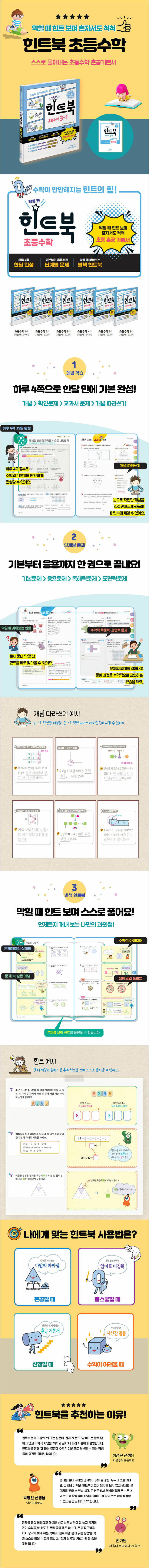학급에서 수학 수업을 할 때 최대한 답을 나중에 알려주면서 힌트를 주거나 문제를 이해할 수 있도록 풀어 설명해 줍니다. 과제집착력, 즉 문제를 끝까지 풀어내고자 하는 태도가 결국에는 수학 실력 향상에 도움이 된다고 생각하기 때문입니다. 힌트북은 아이들이 혼자 공부할 때에도 과제집착력을 기를 수 있는 효과적인 구성을 가진 교재라고 생각합니다. 힌트북은 수학을 잘하고 싶어 하는 아이들에게 기본기를 꼼꼼히 다져주는 좋은 친구이자 선생님이 되어 줄 것입니다.