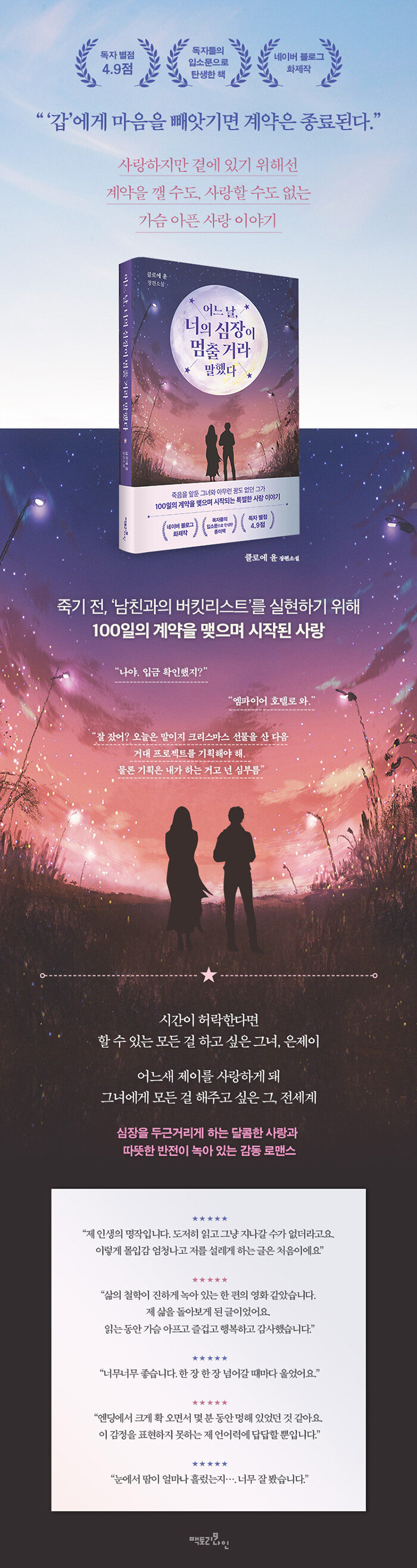 사랑하지만 곁에 있기 위해선 계약을 깰 수도, 사랑할 수도 없는 가슴 아픈 이야기저자는 네이버 블로그에서 소설을 쓰다가 어느 날, 로맨스 소설 《심장아 나대지 마》(現 어느 날, 너의 심장이 멈출 거라 말했다)를 쓰게 되었고, 그 글을 읽은 독자들의 열화와 같은 지지를 바탕으로 출간을 결심하게 되었다. 이 책은 캐릭터들의 넘치는 개성과 톡톡 튀는 대사가 일품이다. 마치 만화를 보듯 두 주인공의 행동과 표정이 생생하게 머릿속에 그려지는 것이 특징이다. 얼핏 철없어 보이지만 내면에 따뜻함을 가지고 있는 캐릭터가 돋보이는 이 작품은 읽다 보면 주인공의 사랑스러움에 빠져들게 된다. 자극적인 사건들 없이도 한번 손에 잡으면 술술 읽어나가게 만드는 이야기의 힘과 웃음과 재미, 눈물과 감동 그리고 반전이 어우러져 책의 마지막 장을 넘기는 순간까지 손에서 놓지 못할 만큼 중독성이 강한 작품이다.