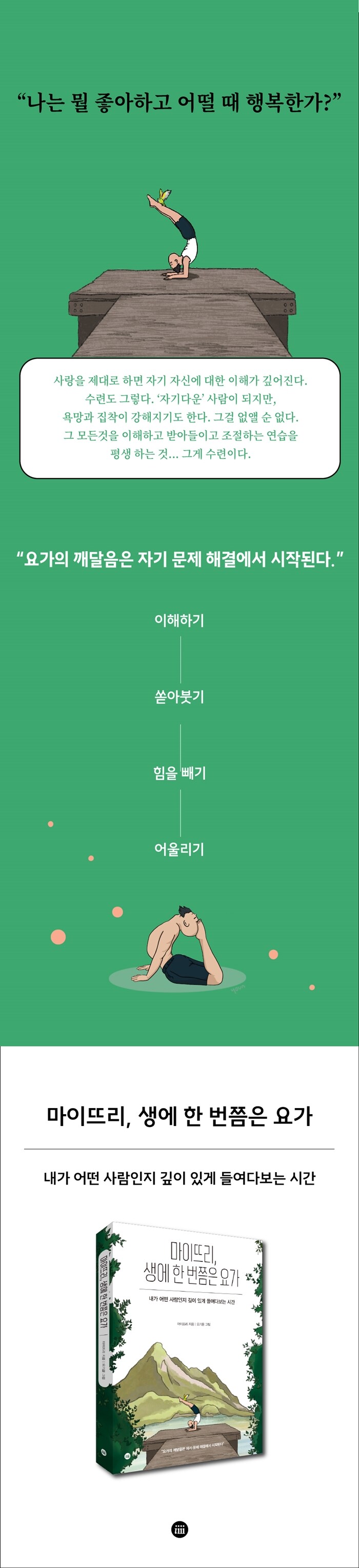 ‘힘들고 아직 인정도 못 받지만, 더 잘할 수 있을 것 같다’바라던 직업을 갖고 멋진 사회생활을 꿈꿨지만, 몸이 아파 아무것도 할 수 없었던 저자에게 요가는 선택할 수 있는 유일한 길이었을지 모른다. 수련하면서 따라오는 온전한 이완과 명상을 통해 저자는 자기 자신을 깊이 이해하게 되었고 한때 원망하기도 했던 세상을 다르게 보게 되었다. 부족한 면이 있다고 해서 다 나쁜 것만은 아니다. 내가 어떤 사람인지 깊이 있게 들여다보는 시간이 필요하다.