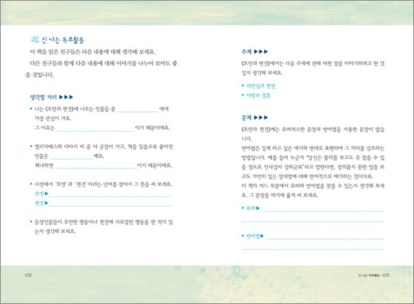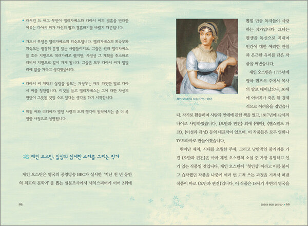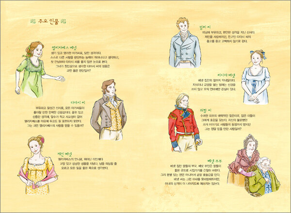 이 책은… <지성과 감성이 자라는 어린이 세계문학고전>은 어린이들이 꼭 읽어야 하는 세계문학작품을 어린이의 눈높이에 맞추어 재구성한 책입니다. 《오만과 편견》은 이 시리즈의 두 번째 책으로, 쉽고 재미있게 읽으면서 원작의 감동과 가치를 느낄 수 있도록 만들었습니다. 원작의 문체를 살리면서도 쉽게 재구성하여 쓴 글, 장면의 느낌을 살리는 그림, 다양한 분야의 전문가 선생님들이 써 주신 추천의 글, 작품 해설과 작가 제인 오스틴을 소개한 ‘《오만과 편견》 깊이 읽기’, 책을 다 읽은 후 직접 독후활동을 해볼 수 있게 꾸민 ‘신 나는 독후활동’을 담았습니다.