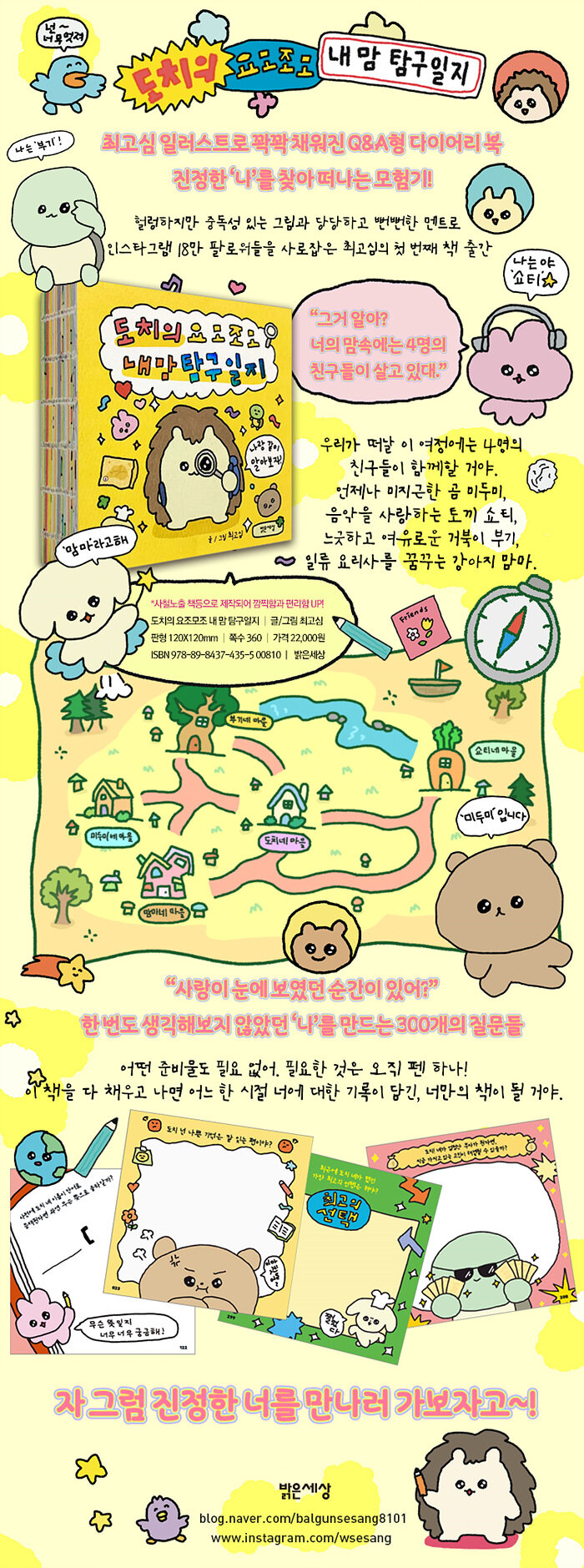 헐렁하지만 중독성 있는 그림과 당당하고 뻔뻔한 멘트로 인스타그램 개설 1년 만에 17만 팔로워들을 사로잡은 최고심 작가의 첫 번째 책이다. “언제나 귀여운 내가 최고”를 외치는 자신감은 바로 자신을 잘 아는 것에서 출발하는 법. 하지만 알쏭달쏭 나조차도 내 마음을 모를 때가 더 많다. 그런 우리를 위해 최고심 작가가 300개의 질문을 준비했다. 이 질문들에 답을 해나가다 보면 진정한 ‘나’와 마주할 수 있게 될 것이다.