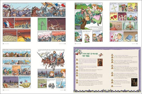 <만화 제대로 된 세계대역사> 27권 소개백년전쟁은 영국과 프랑스가 백여 년의 기간 동안 치열하게 싸운 전쟁으로, 두 나라가 중세에서 근대로 넘어가는 전환점이 되었다고 평가받는 사건이다. 영국과 프랑스는 전쟁 자체는 물론, 전쟁을 수습하는 과정에서 정치, 사회, 문화, 경제, 사상, 예술, 종교 등 광범위한 분야의 변화를 겪으며 한층 발전하게 되었다. 따라서 백년전쟁에 대해 이해하는 것은 중세 유럽의 역사를 이해하는 데 큰 도움을 줄 것이다. 《잔 다르크와 백년전쟁》은 백년전쟁이 일어난 원인과 과정, 결과는 물론 잔 다르크가 백년전쟁에 어떠한 영향을 미쳤는지를 중립적인 관점에서 보여 주는 책이다. 독자들은 바로 옆에서 전쟁이 펼쳐지는 듯한 생생한 내용과 그림을 통해, 백년전쟁을 객관적이고 비판적으로 판단할 수 있는 안목을 가지게 될 것이다.