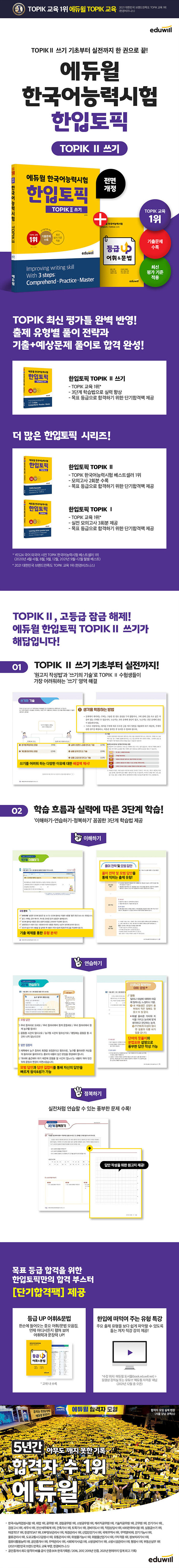에듀윌 한입토픽과 함께라면, 가능합니다.‘에듀윌 한국어능력시험 TOPIK Ⅱ(토픽2) 쓰기’는 한국어능력시험을 준비하는 수험생들을 위한 단계별 학습 맞춤 ‘쓰기 영역 집중 기본서’이다. 이 책은 TOPIK Ⅱ 쓰기 영역에 어려움을 느끼는 학습자들이 빠르고 쉽게 TOPIK Ⅱ 쓰기를 공부하는 방법을 파악하고 실전에 대비할 수 있도록 기출문제를 면밀히 분석하여 학습 방향을 안내한다. 쓰기 영역의 출제 유형 4개를 최신 평가틀에 따라 정리하여 유형별 특징과 더불어 유형마다 알아 두어야 할 개념과 풀이 전략을 제시하였으며, 연습하기, 정복하기 등 기출문제와 예상문제를 아낌없이 수록하여 단계별 학습에 최적화된 흐름과 구성으로 TOPIK Ⅱ 쓰기 영역에 대비할 수 있다. 다양한 무료 서비스로 꾸린 <단기합격팩>은 교재를 구매한 사람이라면 누구나 이용할 수 있으니, 꼭 챙겨 가도록 하자.